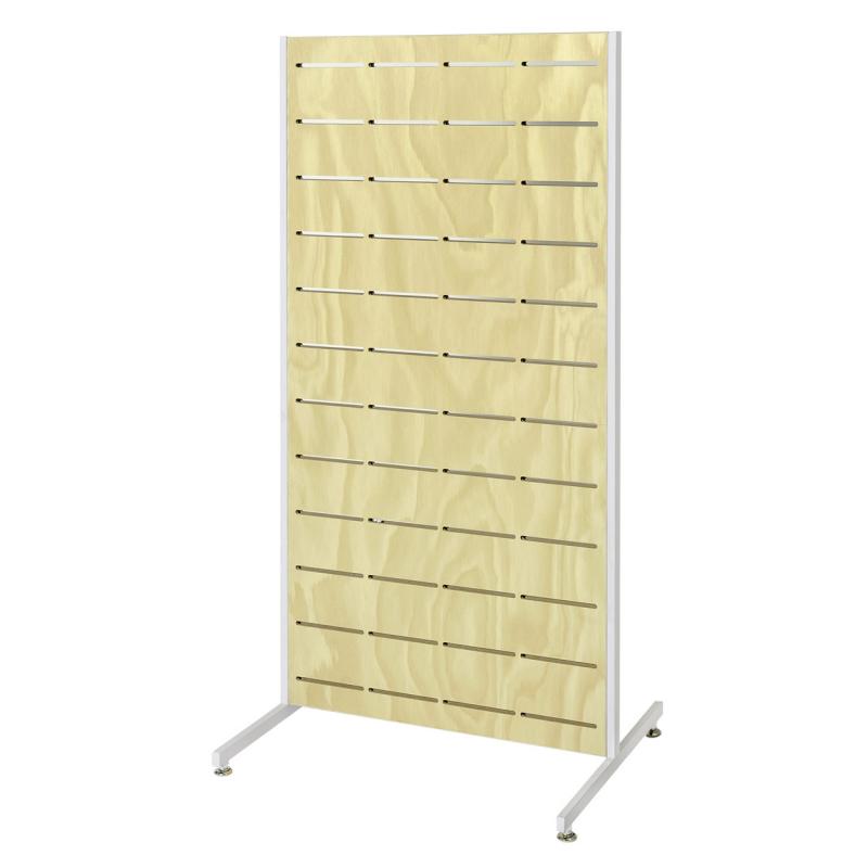This freestanding double sided slat system panel includes double sided legs that come with adjustable glides to ensure the unit is level. You can replace the glides with castor wheels to create an easily transported rack. Each slat is 135mm wide and is compatible with all of our slatwall accessories. Use hooks, baskets, arms or even acrylic shelves to display your stock. Supplied flatpacked with a screwdriver, these slat sytems are an easy 5 minute assembly. Available in black, white or ply.