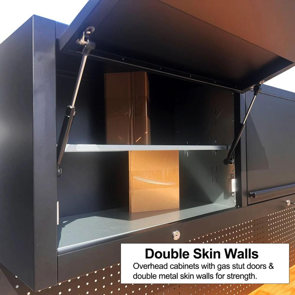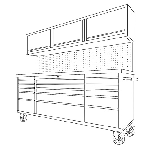This heavy-duty Mobile Workbench & Cabinet Combo offers smart storage and a solid workspace in one unit. It features 15 drawers (45kg capacity each), a pegboard for hanging tools, and a 3-door upper cabinet with gas strut doors. The 35mm solid wood benchtop, anti-fingerprint black stainless steel finish, heavy-duty castors, and secure key locking system make it perfect for any workshop.