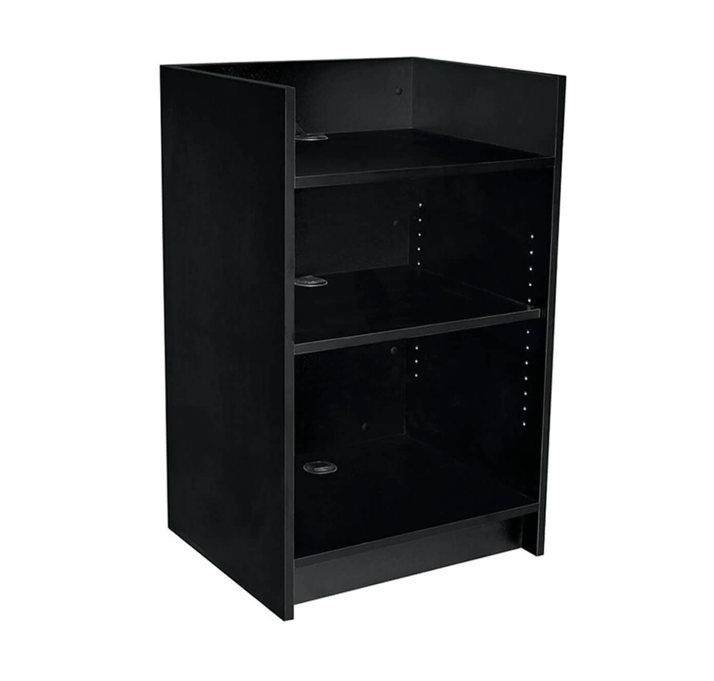 - Includes adjustable shelf and holes for the cords